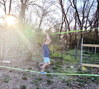 Eli got this "slack line" for Christmas and has been practicing a lot...